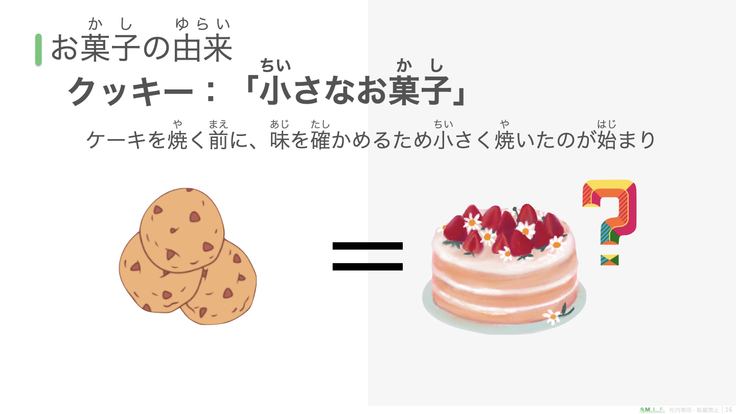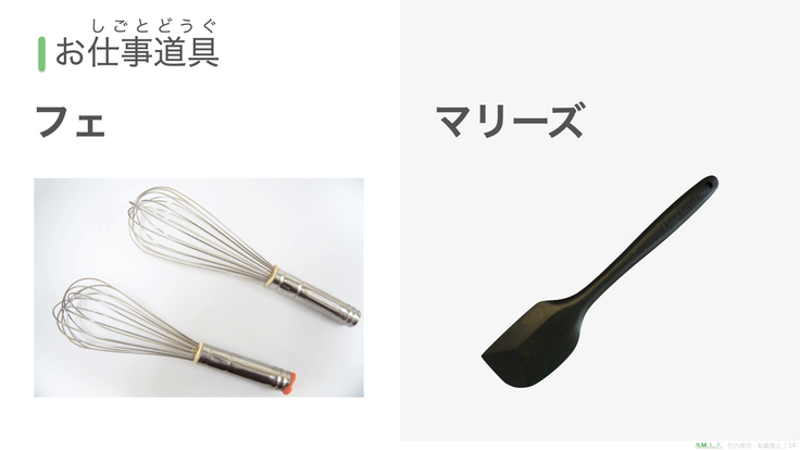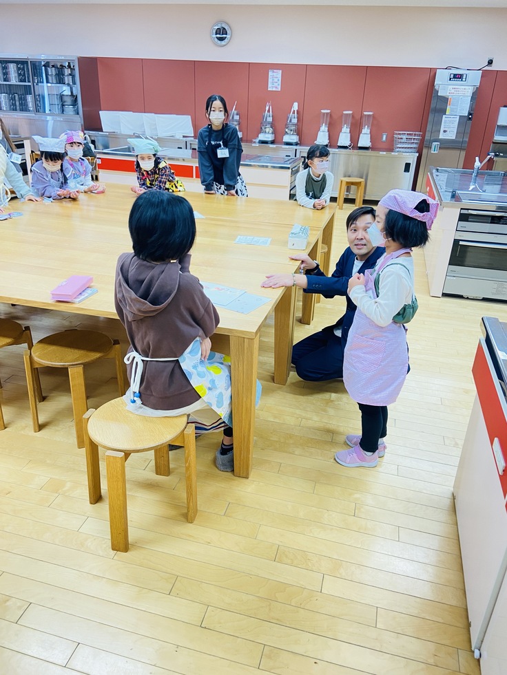 『NPO こども夢育』の体験会はお仕事体験の前に、そのお仕事についての学びの時間を設けています。この体験会では、お菓子の名前の由来やお菓子作りで使う道具の名前などを学びます。