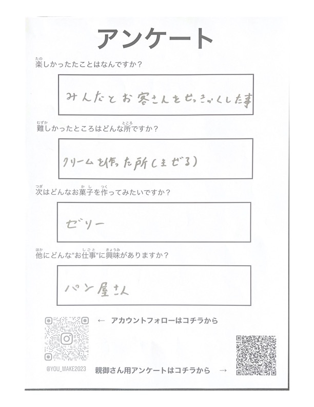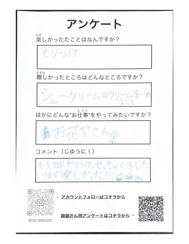 また、親御さんからは継続してほしい、このような体験会は中々ないなど嬉しいコメントが多く寄せられたことは本当に嬉しく思いました。