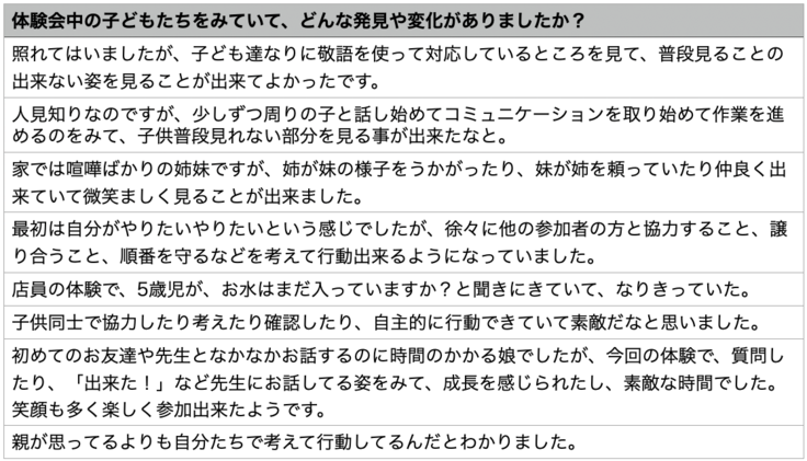 参加された保護者のみなさま、子どもたちの体験会後のアンケート結果も報告しております。