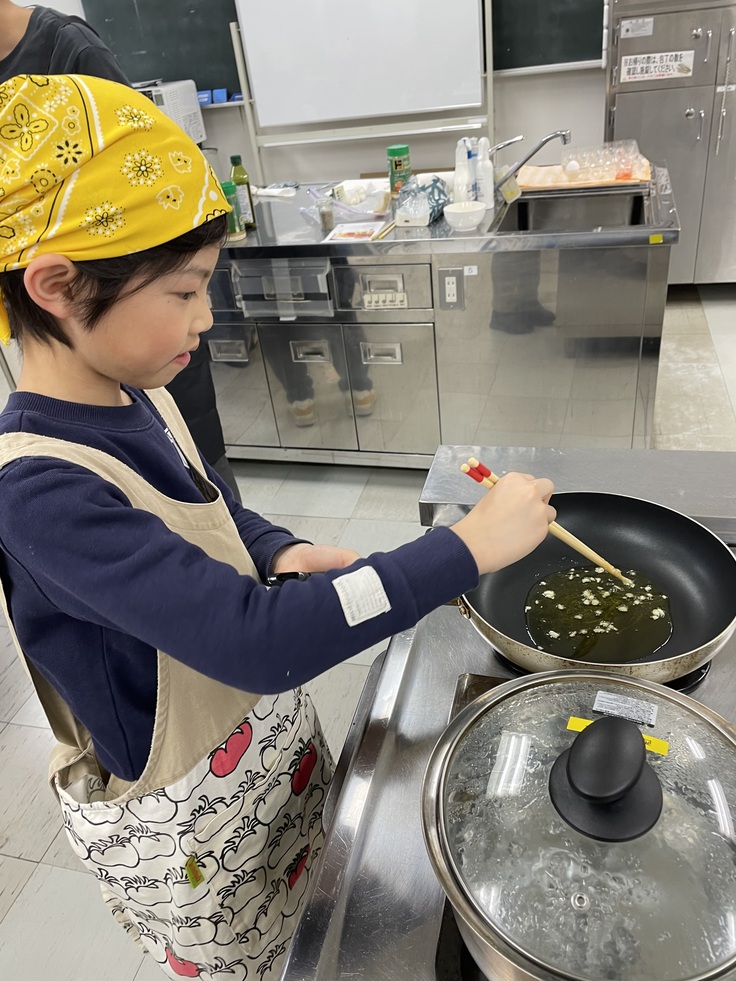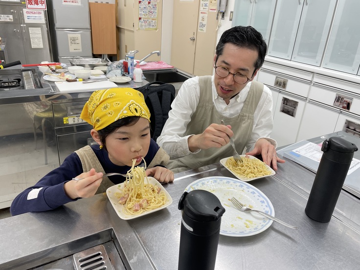 3. 2回目のパスタ作りは 1回目の失敗をもとに手順を確認したり、改善点を自分たちで見つけてもらい、そして試食をもとに味付けのブラッシュアップをする。