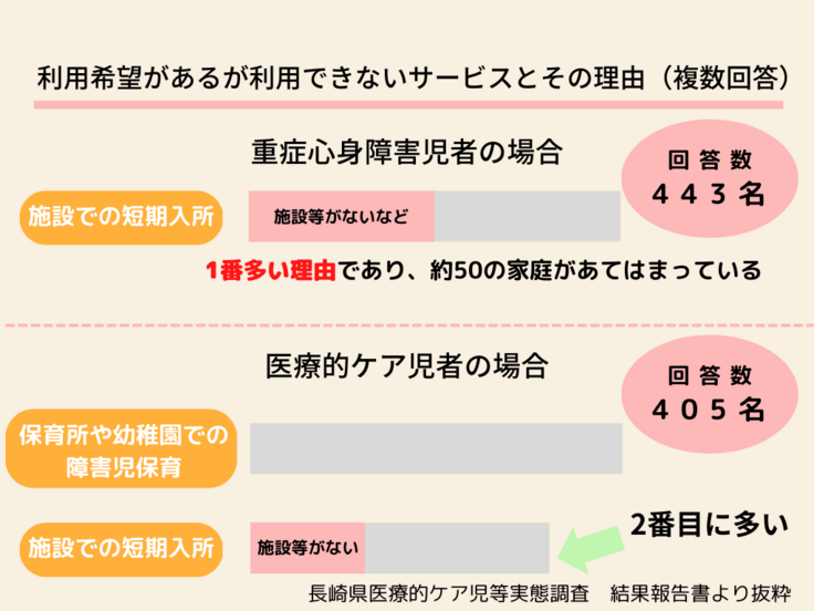 特に、昼夜問わずケアを行うご家族にとって、身体を休めたり、きょうだい児の行事へ参加するなど医療的ケア児の預け先である短期入所事業所は全国で不足しています。