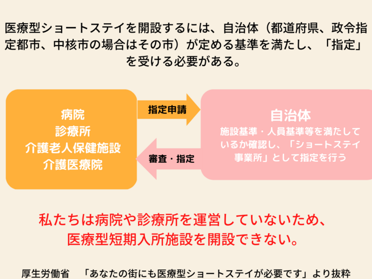 近年、医療型短期入所施設が不足していることは厚生労働省の調査で分かってきていますが、医療型短期入所を開設するためには病院や診療所、介護老人保健施設、介護医療院でなければ自治体から指定を受けることができません。
