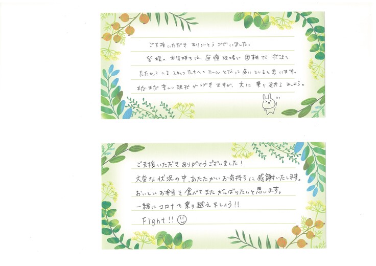 みなさまからの温かい応援と御支援をいただいて進めてきたユアベスの活動で、食事を受け取った医療従事者の皆さまからご利用を終えてみての感想やコメントをいただきました。支援者の皆さまをはじめ、【ユアベス】を応援してくださった皆さまにお届けします。
