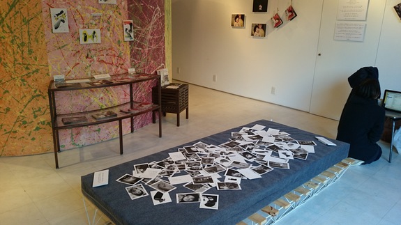 展示空間中央には、自力で座位をとることが難しい利用者さんの日常を想起させる「ベッド」を配置し、作品となる写真やキャプション入り葉書をレイアウトしました。自由に手に取ってご鑑賞いただけます。