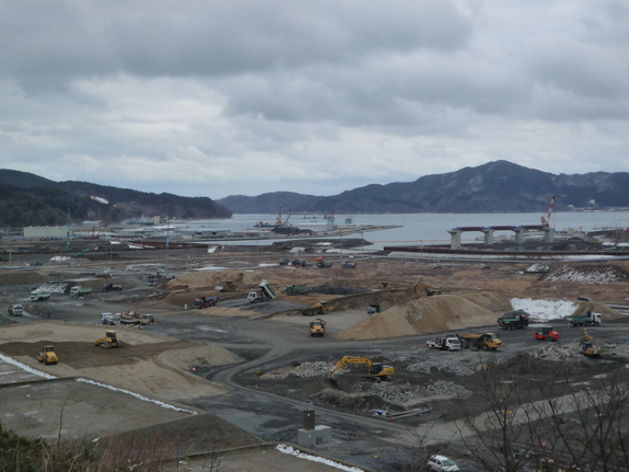 旧役場の裏側にある小高い山に登ると、街の様子が見渡せます。たくさんのトラックが行き交い、かさ上げをしている様子が見られました。