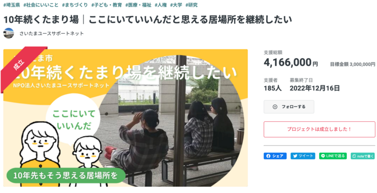 現在の法制度では支援の届かない子ども・若者たちを対象とするこれらの活動の多くは、活動に賛同してくださった方々からのご寄付で運営してきました。昨年末には、たまり場の運営のためにクラウドファンディングに挑戦し、多くの方からのご支援をいただきました。心より御礼申し上げます。