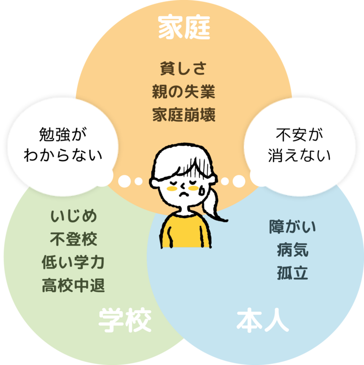 孤立した子ども・若者たちが抱える「生きづらさ」は、社会で向き合うべき課題です。困難の背景には、複合的で重層的なリスクがあります。