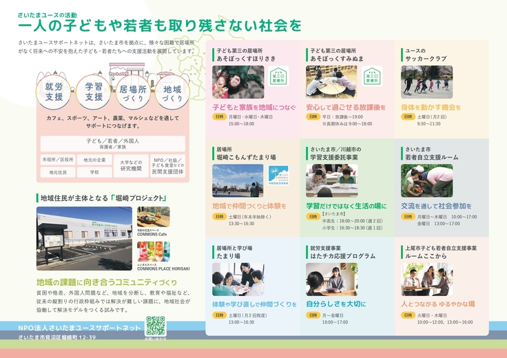 さいたま市を拠点に、様々な困難により居場所がなく将来への不安を抱えた子ども・若者たちへの支援活動を展開しています。
