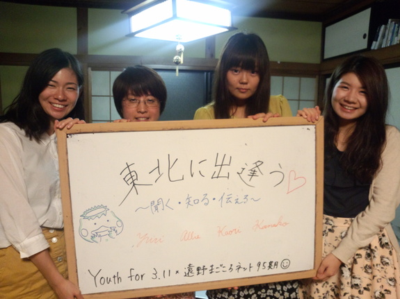 「Youth×遠野まごころネット」は今回で95期となりました。この期の関東からの参加者は女性4名です。みなさん東北へのボランティアが初めてで、中には震災当初は高校生で地元茨城で実際に被災された方もいました。住んでいたところでは2週間ちかく断水し、隣町の親戚のお家に避難されたそうです。