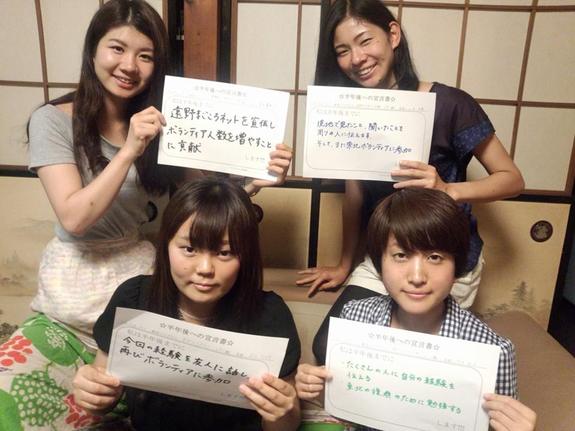 みなさんボランティアとして東北に行かれるのが初めてで、実際に自分の住んでいたところが断水したりと震災の被害を受けた方もいました。三年半経ち、報道される機会が減った今、どのように変化しているのかを実際に見てきたいという思いを込めてこのようなスローガンになりました。