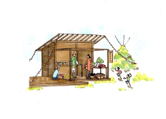 (遊眠堂のえみさん作の小屋の完成予想図。このマルシェが人と地域と社会と自然との繋がりの架け橋となりますように。)