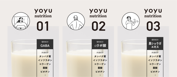 産後のママに不足がちな、タンパク質、イソフラボン、ビオチン、コラーゲン、葉酸等の豊富な栄養素に加えて、特にGABA、αリポ酸、黒ショウガエキスをそれぞれ多く含む3種類(yoyu nutrition 01, 02, 03 )ご用意しました。