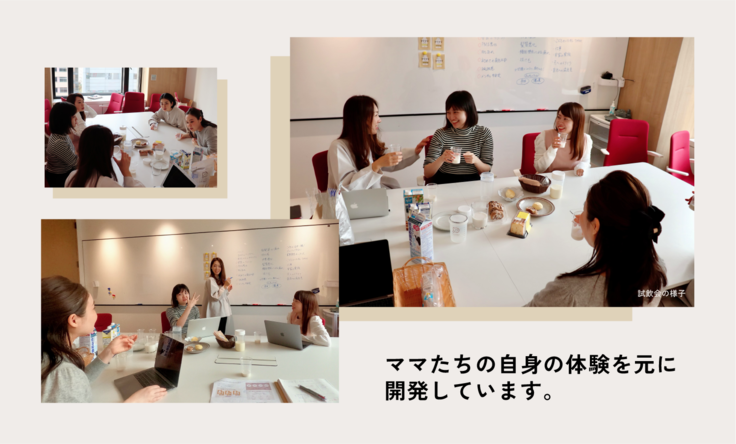 「忙しいママに、粉とミルクを混ぜてもらうのはどうなのか?」という議論が開発段階でありました。しかし、固形物の栄養補助食品には凝固のために油や不純物が含まれていたり、身体への吸収が粉状より劣ったりする側面があることから、ママの身体に栄養を素早く・良いものを届けたいと思い、最終的に粉状でお届けするスタイルに至りました。