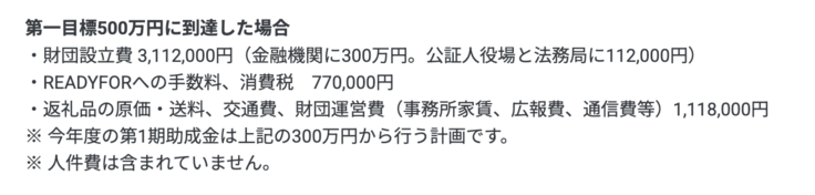 そしてクラファンで500万円に到達はしましたが、プロジェクト本文(「6. 資金の使途」)を以下で引用しますように、人件費を計上していません。