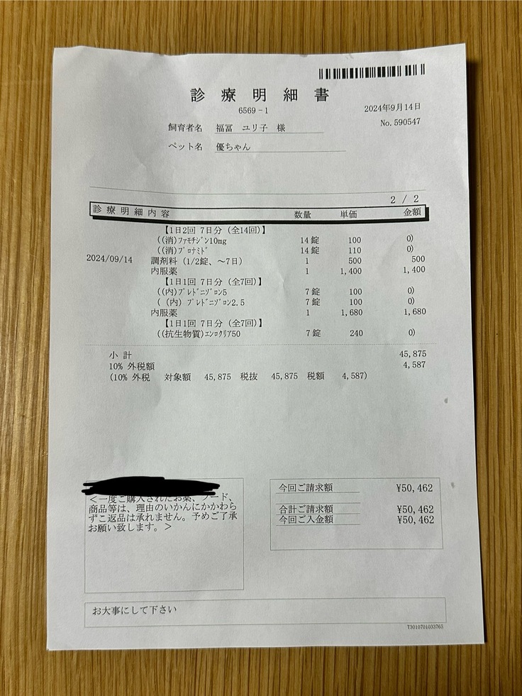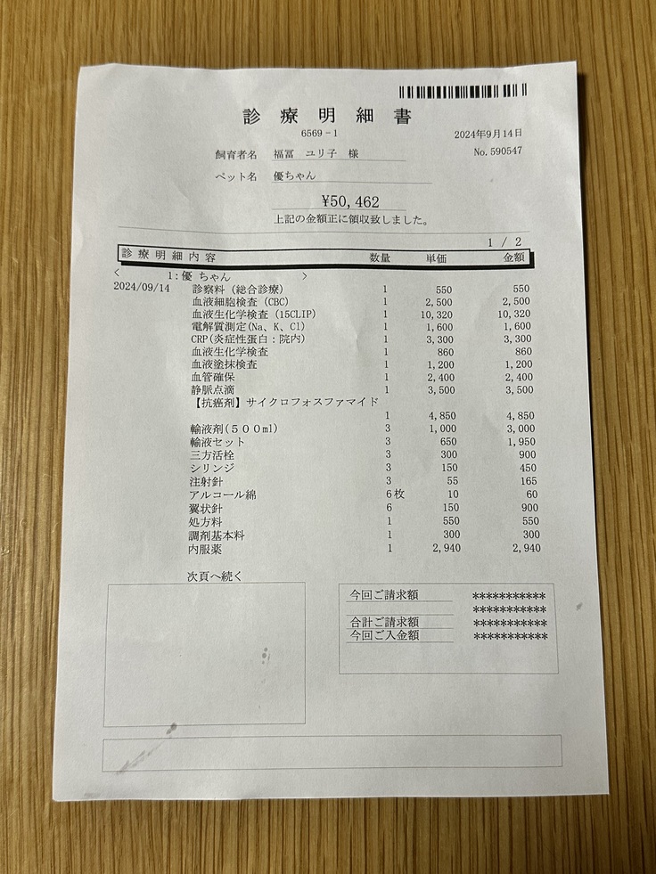 今回はサイクロフォスファミドという少し腎臓にダメージ与える抗がん剤だったので、自宅でする補液も出してもらいました!