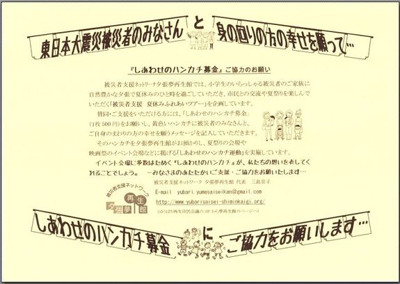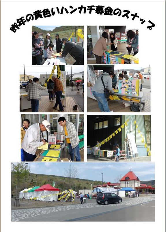不足分を「黄色いハンカチ募金」として、様々なイベント会場で「黄色いハンカチに、身の周りの人と被災者のみなさんの幸せを願って、メッセージをかいていただき、500円の募金をお願いするハンカチ募金を実施しました。