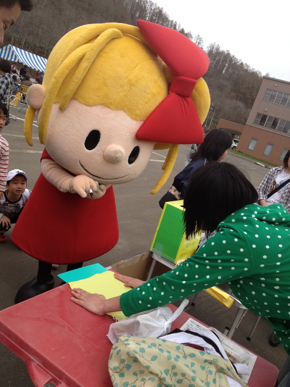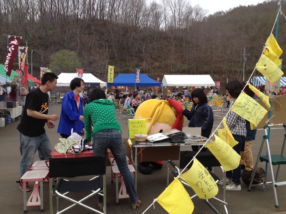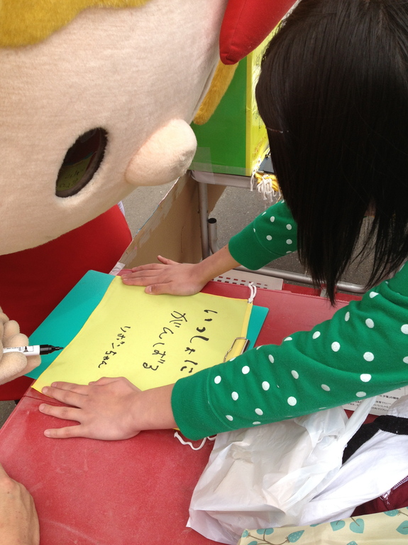 (黄色いハンカチ一枚¥500で購入して頂き、メッセージを記入。夕張夏祭りの時、やぐらの周りに広げます。前回の記事中の写真参省)