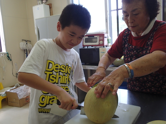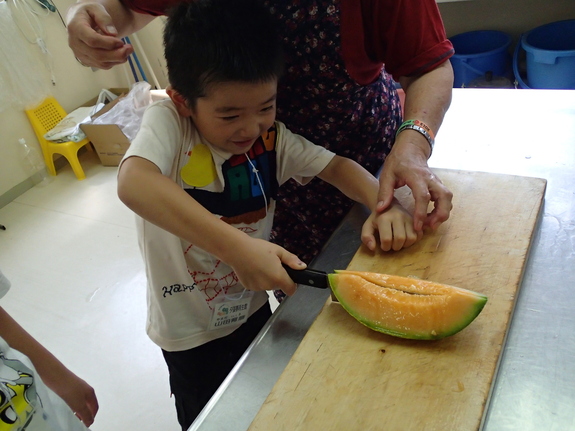 せっかくなので大きい子で初のメロン入刀です!弟くんもお手伝いしてくれました!