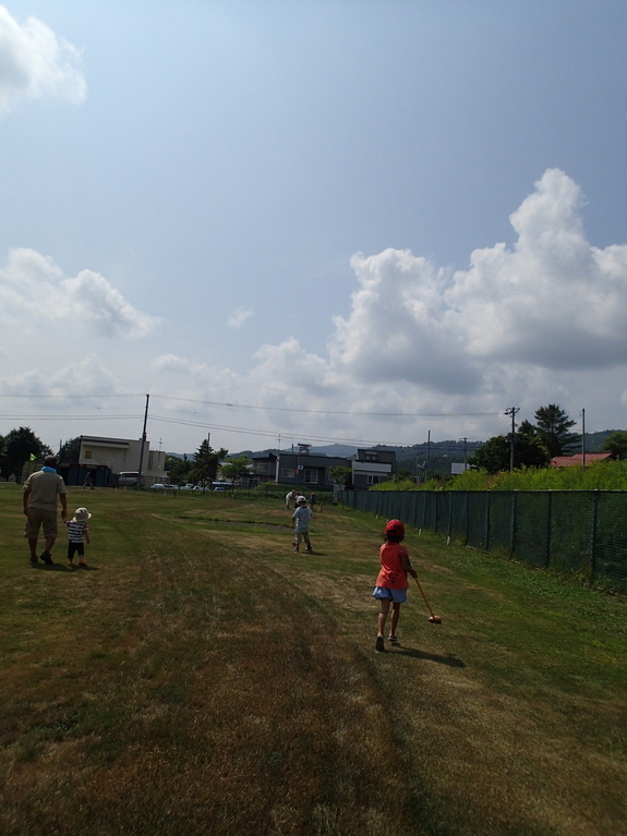 私も一緒に遊んでいましたが、昨日あたりから北海道にしては暑い30度近いなかで汗びっしょりでした。お水やお茶を飲みながらもみんな夢中で遊んでいました!!