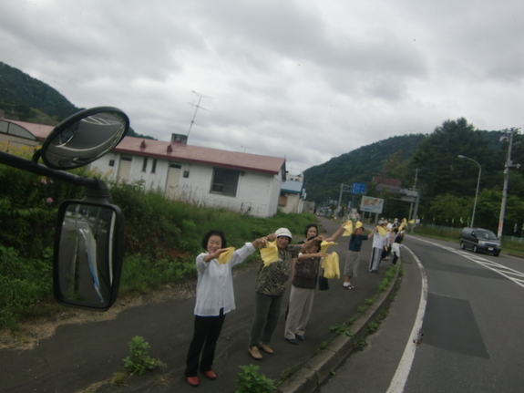 昨年同様、貸し切りバスを提供してくれた「花ちゃん」の華麗なるバスさばきで出発し始めると、帰りの沿道にも紅葉山地区の皆さんが、ハンカチでお見送りをしてくれました!
