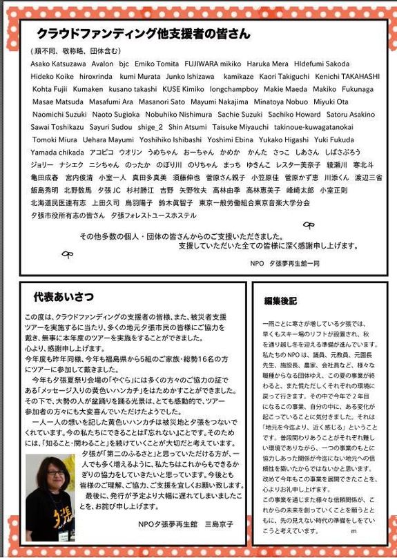 大変遅くなってしまいましが、本年度《夕張夢再生館通信》のvol-3〜最終号〜が、やっと完成致しました。予定では8月の末頃、ご支援戴いた方へお送りするつもりでしたが、スタッフの都合が合わず一ヶ月遅れでの作成・配送となってしまいましたこと、お詫び申し上げます。