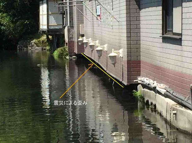 このペンションは建物前面が水上にあるため水中の基礎が今回の地震で地盤沈し、建物が全体的に湖側に「落ち込む状態」になっています。しかも1,000回を超す余震のため震災後も少しづつ湖に引きずり込まれ、全体的に傾きねじれていることから内部にも大きな歪みが発生、特に階段は衝撃的な問題が発生し歩行が危険なため震災以降は施設を閉鎖しています。