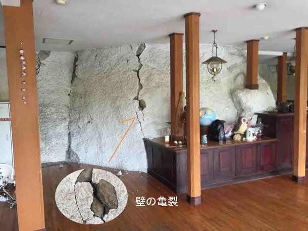【写真左】客室やロビー、廊下など壁のヒビは建物全体に数十ヶ所入っています。