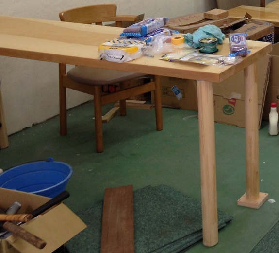 食堂の机は、加藤さんが使わずに保管していたイチョウのまな板(長さ1m80cm、厚さ9cm)を半分に切って、脚を付けてつくりました。