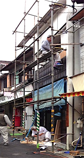 昨日は、足場を組み、壁面のアルミパネルの撤去や木製建具設置などの作業を開始しました。建築施工や塗装の地元業者の方々に大変ご尽力いただいております。