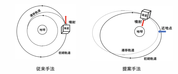 新たに提案する手法は、地心方向に向けてスラスタを噴射することで軌道を変形させ、近地点高度を下げて大気抵抗により徐々に減速するというものであり、従来手法と比較して厳密な姿勢推定・制御が必要ありません。そのため、機能要求が少なく小型の衛星でも十分に採用が可能であると考えられます。