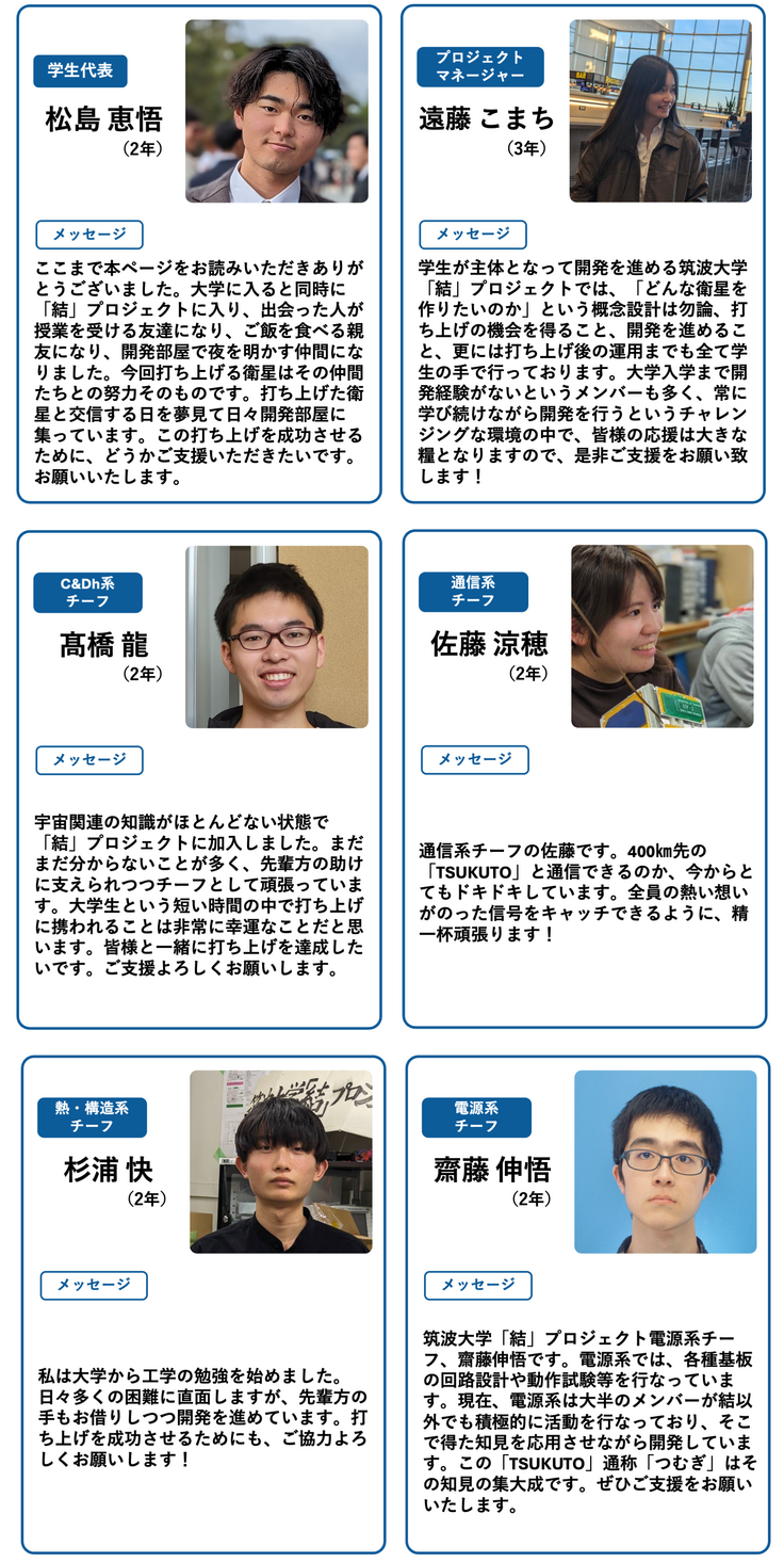 筑波大学「結」プロジェクトにご興味を持っていただき、ありがとうございます。当団体では、筑波大学の学生が主体となって超小型人工衛星の開発に取り組んでいます。私たちはこれまでに2機の人工衛星の開発、打上げを成功させていて、現在新たな人工衛星「TSUKUTO」を開発しています。皆様のご支援がプロジェクトを継続していく原動力になります。どうぞよろしくお願いいたします。