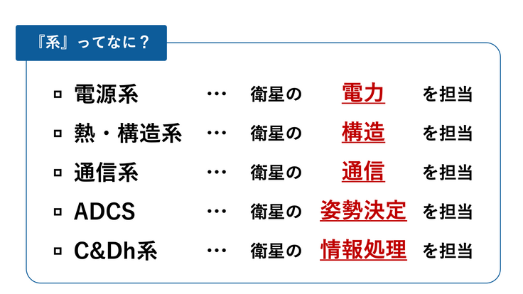 ※私たちは開発にあたって衛星を「系」と呼ばれる5つのシステムに分類しており、各系に専門の開発チームがついています。
