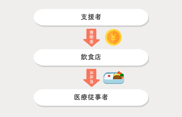医療従事者に加え、コロナ禍で大変な思いをされている業種の代表格の一つに「飲食業」が挙げられると思います。このプロジェクトでは、皆様から寄付していただいたお金で、地域の飲食店からお弁当を買い上げ、対象となる医療機関に届けることで感謝の気持ちを伝える、という支援のサイクルを生み出したいと考えています。