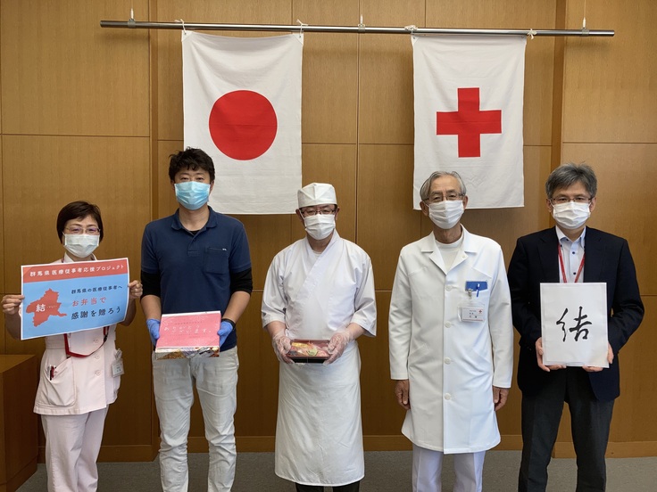 公募した飲食店の中から選定した地元の「さかえ鮨」さん、「吾妻弁当」さんのご協力により、お弁当276食を滞りなくスムーズに配達することができました。もちろん、皆さまからお預かりしたお手紙も添えてあります。裸でお渡しするのも無骨なので、書家の小澤蘭雪様から寄贈いただいた「結」の文字を転写した封筒に包んでのお渡しです。プロジェクトの概要が記載されたチラシも併せてお渡しいただく段取りとなっておりますので、このお弁当に込められた想いは、しっかりと現場の医療従事者の方々に伝わるものと確信しております。