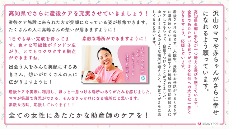 温かいメッセージに、胸が熱くなる思いです。皆様の応援を力に変え、必ずや香南市に産後ケア施設を設立させたいと思います。