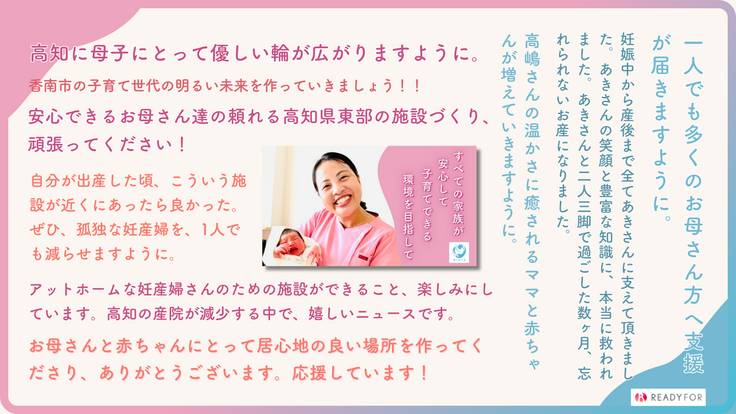 【香南市の母子に産後ケア施設を!笑顔で子育てができる場所を作りたい】
