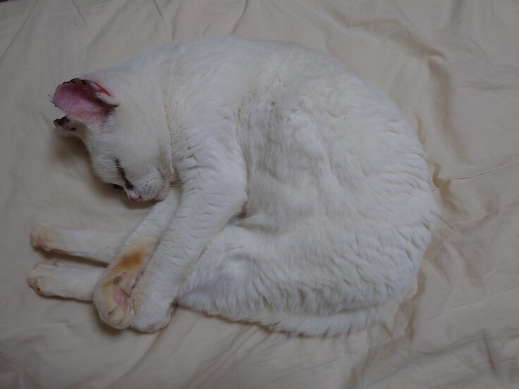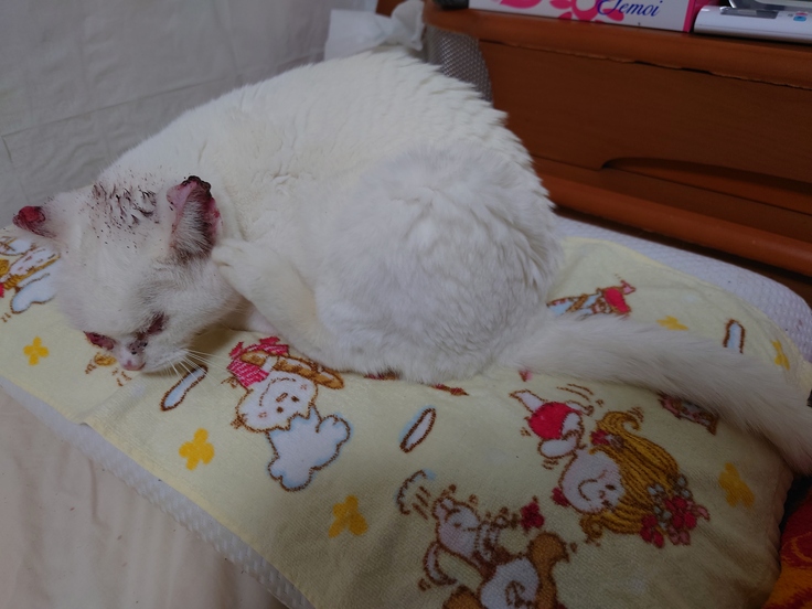 ▲自宅にて静養中のユキです。寝ていることが多いです。飛び散っている血液等ご容赦下さいませ。