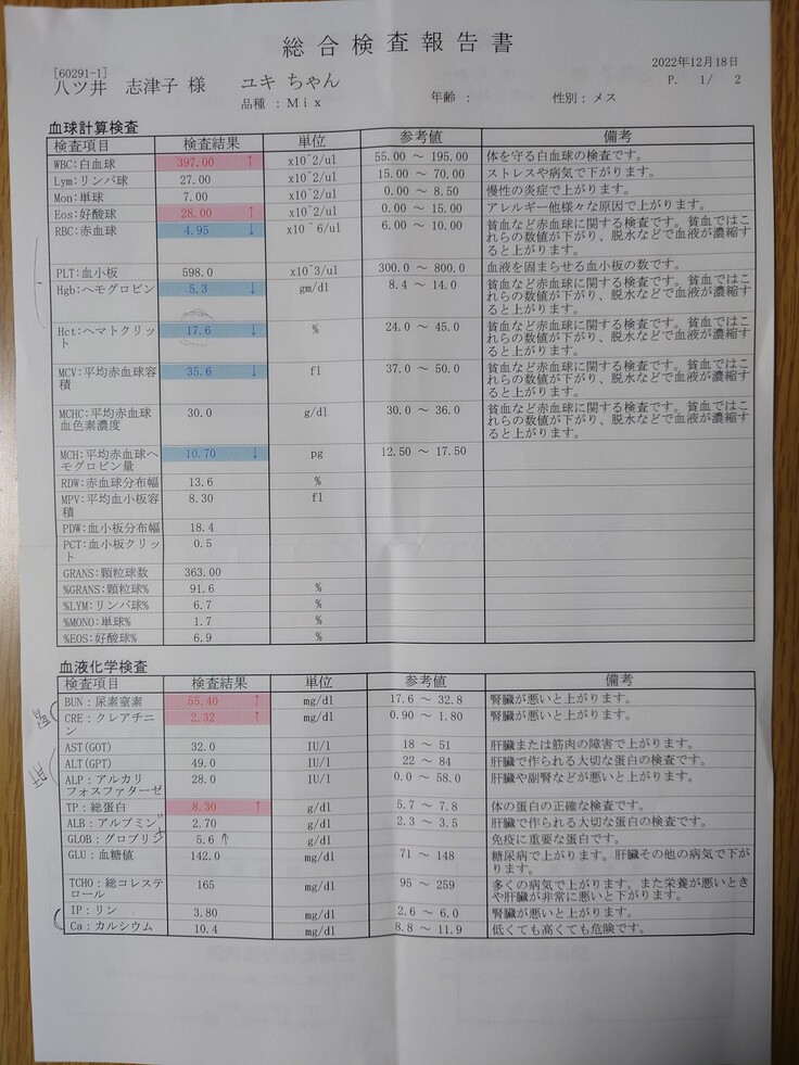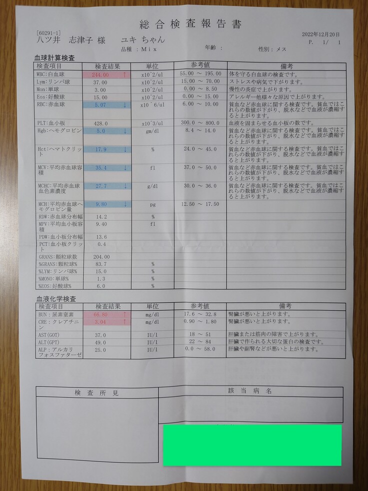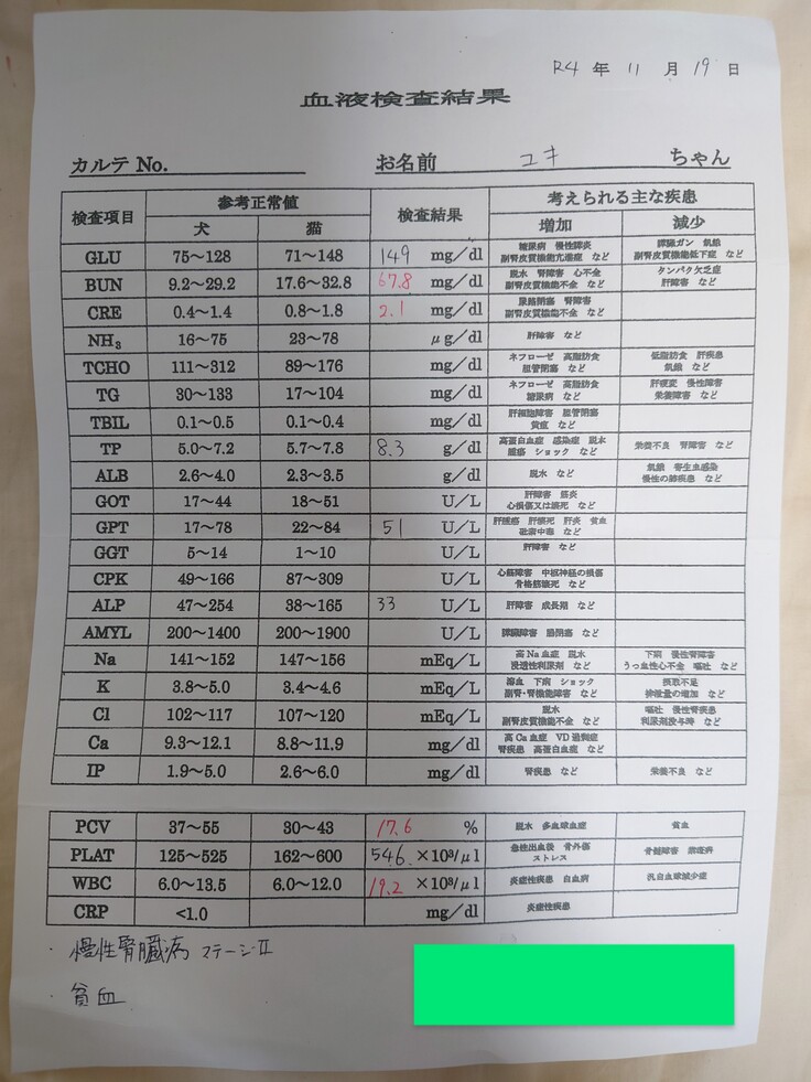 ▼血液検査の結果。この時点で皮膚がんに加え慢性腎臓病ステージ2、貧血と診断されました。皮膚がんの手術をしようにも腎臓病を患っていると、麻酔のリスクがありますと言われそのまま帰宅しました。この時、何の手立てもないのだと半ば諦めて、苦痛に耐えるユキを看取る覚悟でした。