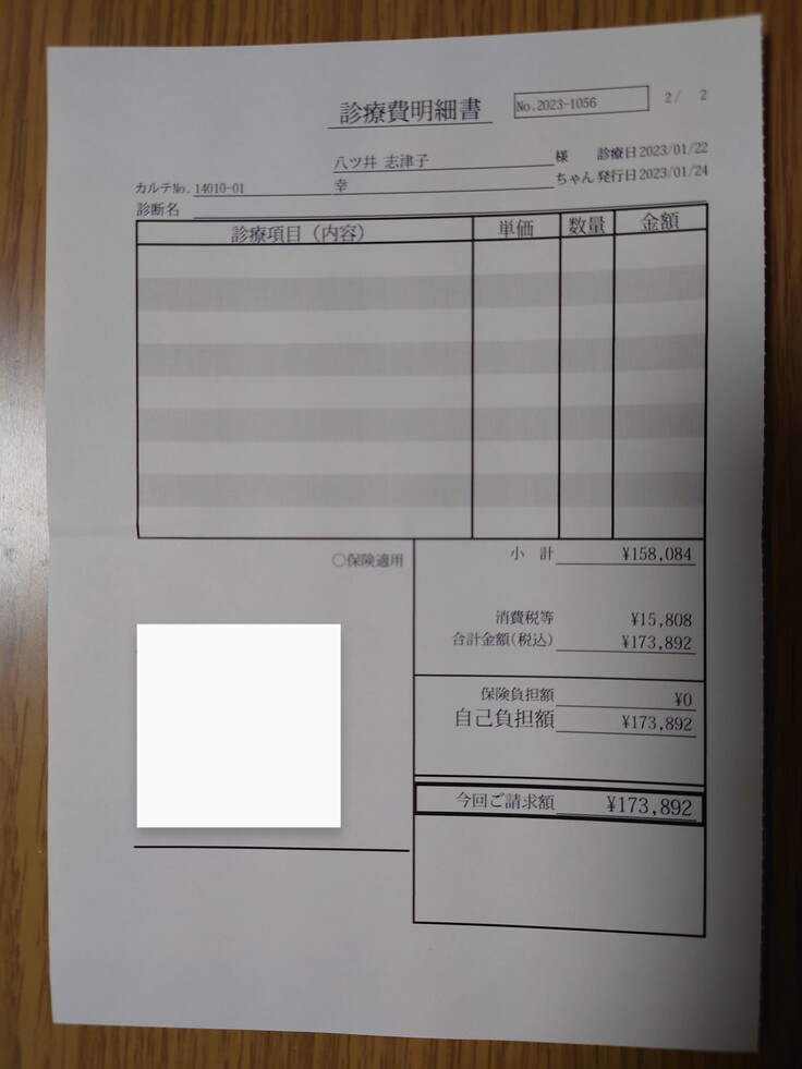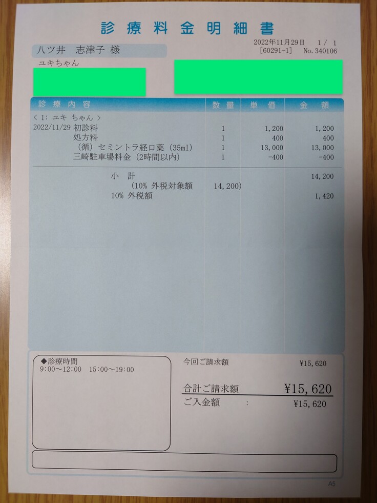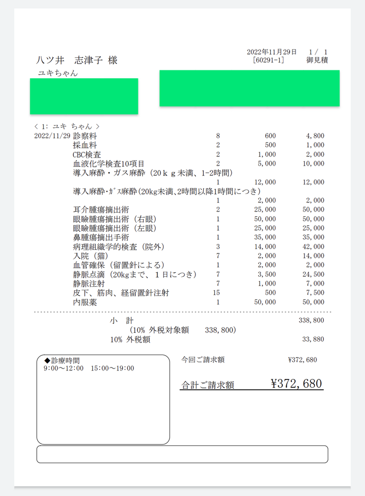ページ上に掲載している検査表、診療明細書、手術見積書、診断書の資料は受診した二軒の動物病院から全て掲載の許諾を得ております。