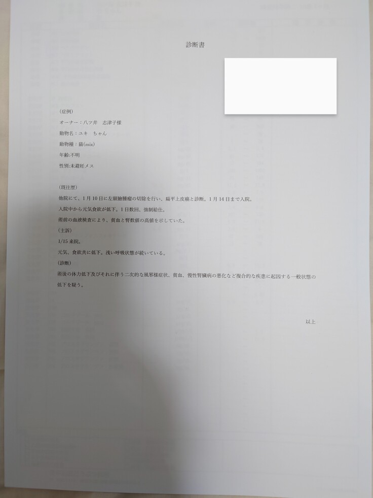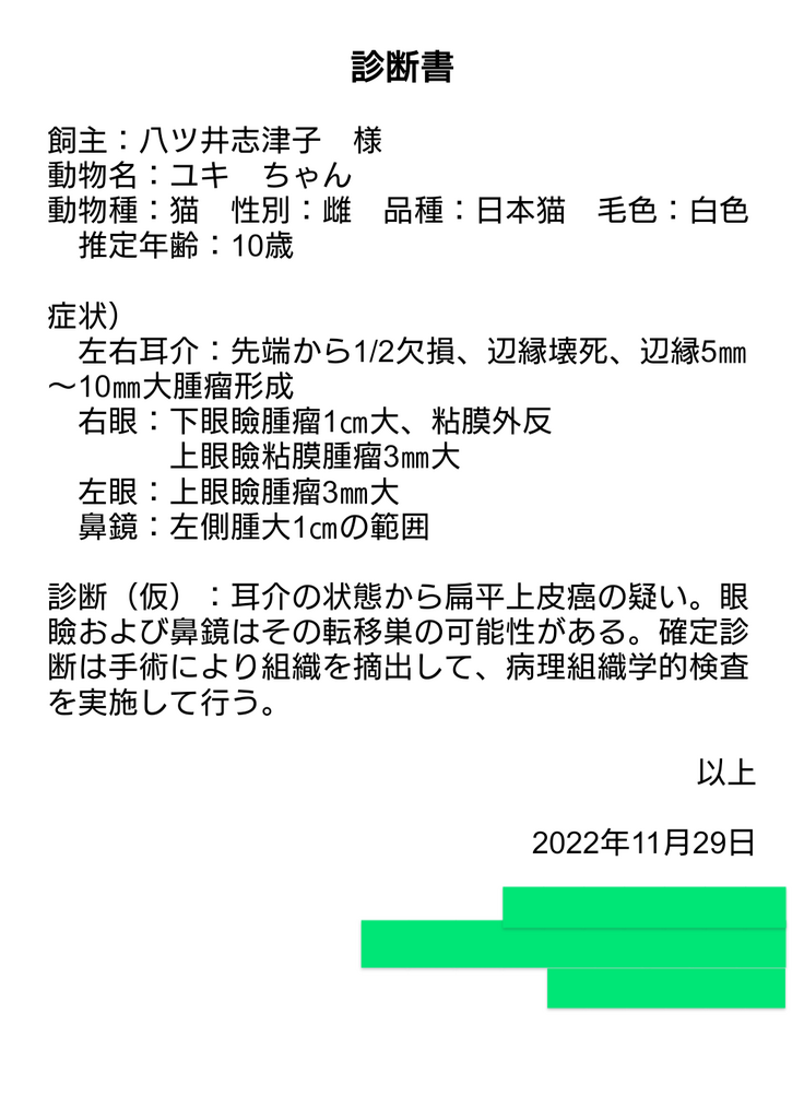 ささやかになりますがお礼のメール、ユキのその後の経過を報告させて頂きます。治療が落ち着いた2023/03頃を予定しています。時間がかかってしまい大変申し訳ありません。また写真を送りたいと思う気持ちはありますが血液、瘡蓋等が多いため控えさせて頂きます。術後の写真は腫れなどがひいた段階で掲載したいと思います。