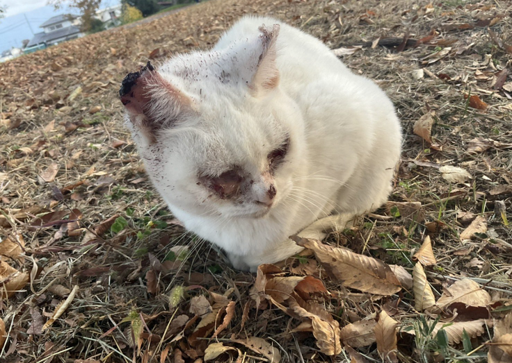 初めてユキを目にしたのは忘れもしない11/10のお昼過ぎ。SNS上の写真は11/9付、保護依頼の内容でした。耳や瞼から出血し落ち葉の中でうずくまっている白猫さんでした。夜になっても保護情報はなく、気がついたら知り合いの保護団体の方から捕獲器を借り現地に向かっていました。「こんな寒空の下に一人で居させることはできない」。その思いだけでした。日付が変わり11/11、私は白猫さんを連れて帰ることができず、ただひたすら心の中で「白猫さん、ごめんね」と繰り返していました。