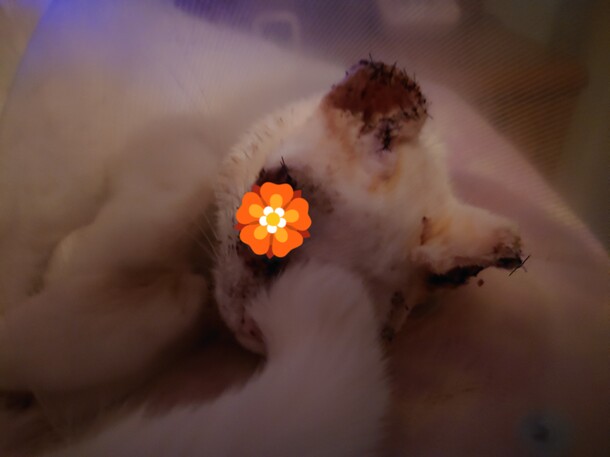 まだ術後の右瞼の瘡蓋が痛々しいので。両耳介とも傷みは引いて、ずっと痛くて横になれなかった右側でも横になれるようになりました。ただ、また鼻詰まりが復活で毎日ユキの鼻水と格闘中です。