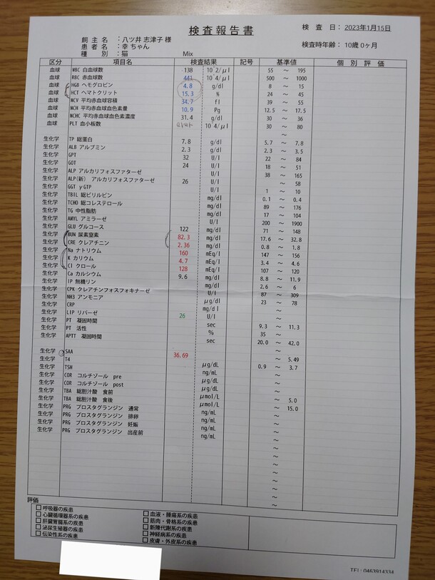 退院翌日に食欲不振、飲水低下であまり普段しなかった横になって眠る時間が多かったため、近くの病院へ行き急遽受診。レントゲン異常なし、皮下輸液、腎臓病用ちゅーるを食べさせてもらい帰宅。少し落ち着き機嫌が良くなりました。