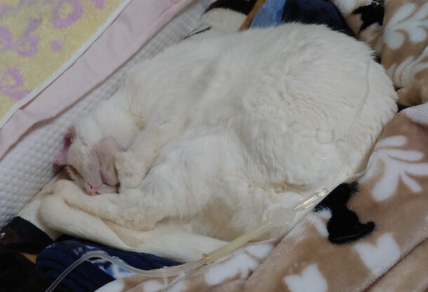 腎臓病の血流検査でした。少しでもユキの負担を少なく、費用を抑えるべく皮下点滴は自宅で💪