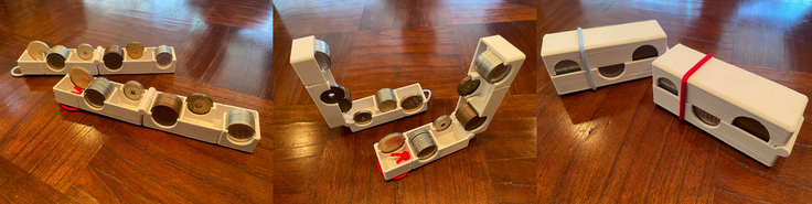 このデザイン2は、硬貨を互い違いに配置することにより、コンパクトに折りたたみができ、財布として持ち歩けるようになっております。こちらは日々の暮らしの中で使って頂くのに便利です。色付きのオシャレなゴムで止めて頂く予定です。