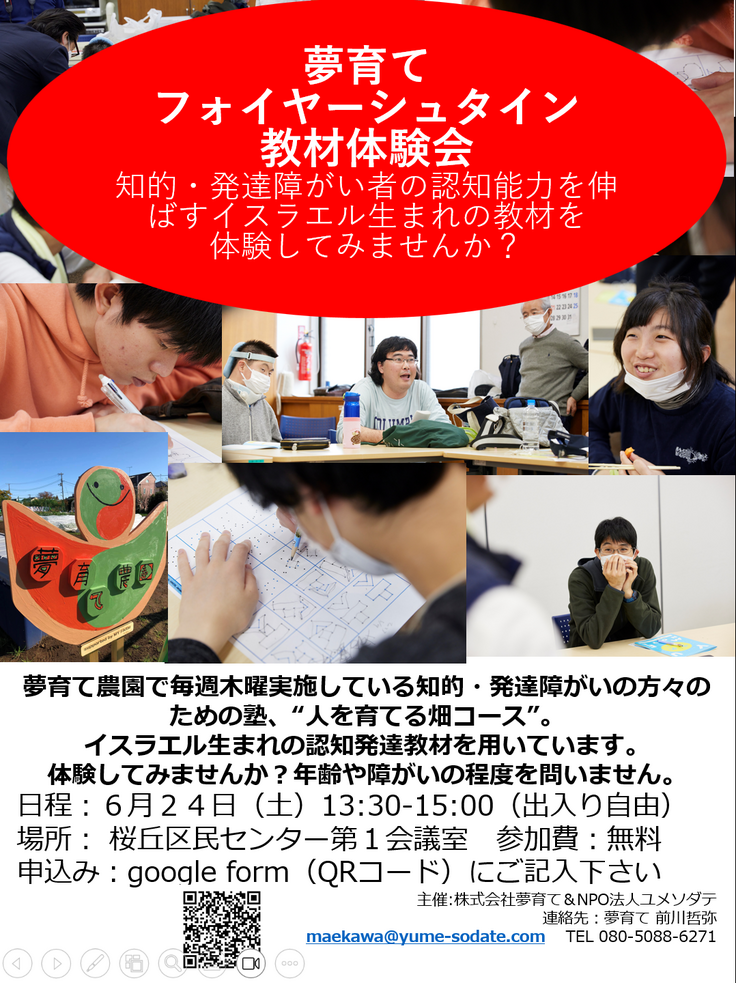 そして今回は、ついに学ぶ側が体験できるよう、無料の体験会を開催します!6月24日(土)13:30~15:00桜丘区民センターで実施します。無料ですが、以下のURLからお申し込みをお願いします。https://docs.google.com/…/1uenGEiq3SPP1pT285nzv44S…/edit