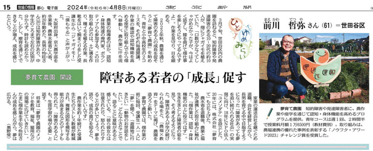4月8日(月)東京新聞15面都心版で、夢育て農園を取り上げて下さいました!