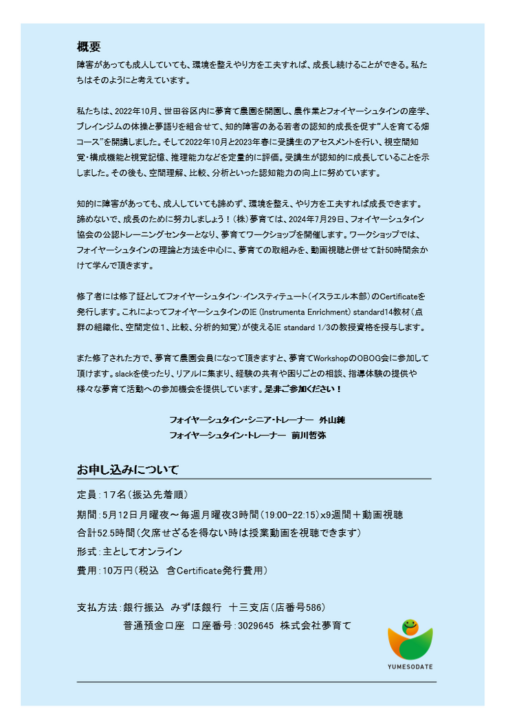 また修了された方々が、農園や塾や学校や事業所や職場等、それぞれの現場で学んだ方法を用いる時に、しっかり成果があがるよう夢育てが伴走させて頂きます。