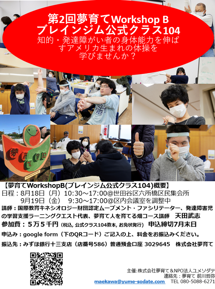 そしてこの夏久しぶりに、夢育てワークショップBとして、お免状を出すブレインジム104講座を2日間の日程で行います。こちらは、世田谷区内の教室に集まって頂いて学ぶ形式です。