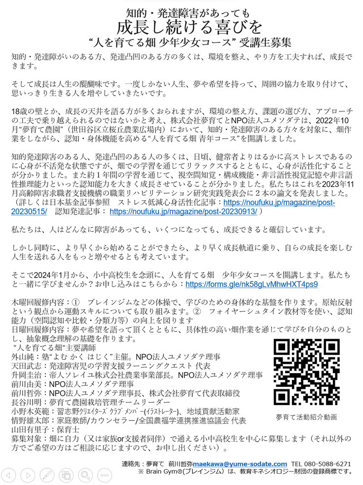 知的・発達障害、発達凸凹の方々を対象に、2023年10月の開講以来、注目を集めてきた”人を育てる畑”は、体操座学と畑作業を組み合わせることで、確かに認知的成長が実現されていることが確認できました。